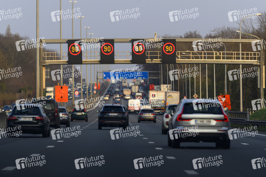Geschwindigkeitszeichen Zulässige Höchstgeschwindigkeit 90 km/h auf einer Autobahn in Belgien. (Themenbild, Symbolbild) Heverlee, 03.04.2022