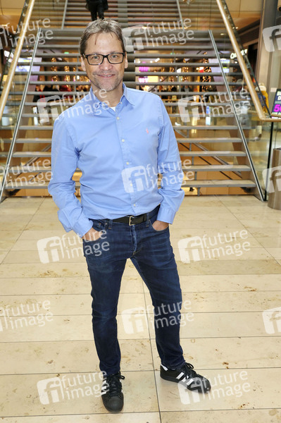 Patrick Bach beim Fototermin mit Service-Roboter 'Fiete', einem mobilen Spender für Hand-Desinfektionsmittel der Firma Autonomous Units, in der Europa Passage, Hamburg, 28.11.2022