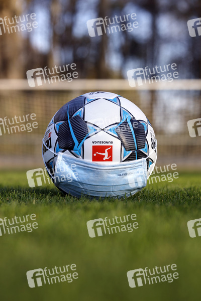 Der offizielle Spielball der Bundesliga Derbystar liegt mit Mundschutz auf einem Fußballplatz. Köln, 11.04.2020