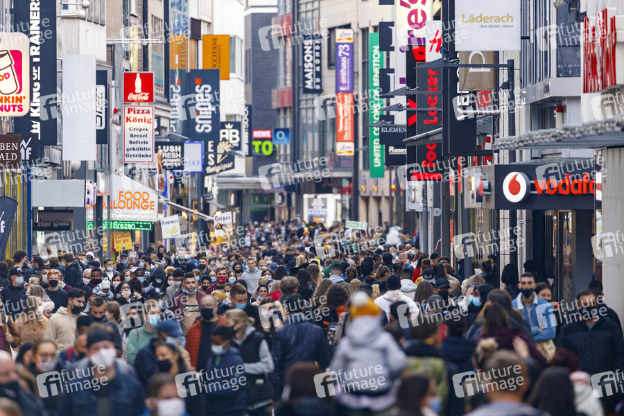 Köln ist weiter Corona-Risikogebiet: Im öffentlichen Raum besteht auf vielen Plätzen und Straßen in Köln die Pflicht zum Tragen einer Mund-Nase-Bedeckung, so etwa für sämtliche Fußgängerzonen und Einkaufsstraßen, in der Altstadt, auf den Kölner Ringen, auf dem Rheinufer linksrheinisch zwischen Mülheimer Brücke und Südbrücke, auf dem Rheinboulevard sowie bei Versammlungen nach dem Versammlungsgesetz. - Im Bild die Hohe Straße mit Passanten. (Themenbild, Symbolbild) Köln, 02.11.2020