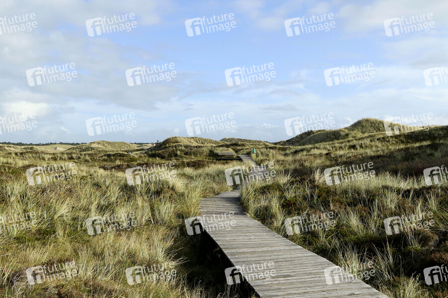 Holzbohlenweg durch Dünenlandschaft auf der Insel Amrum. 22.10.2020