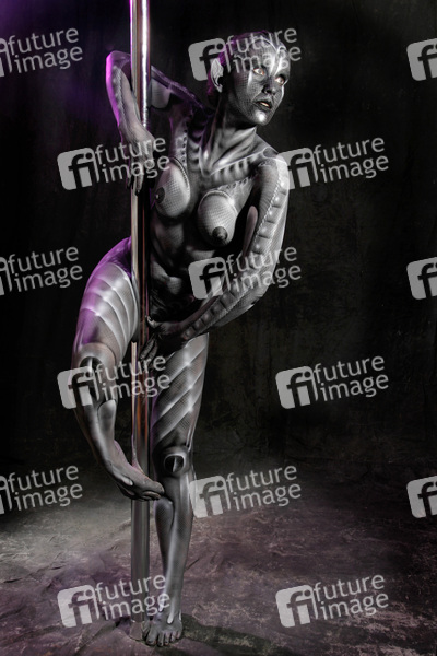 Bodypainting, Erotik, Frau, nackt, drinnen, weiblich, Monster, Außerirdische, Alien, Echse, Körperkunst, Kunst, Malerei, monochrom, erotic, woman, nude, indoor, female, monochrome, lizard, body art, body painting