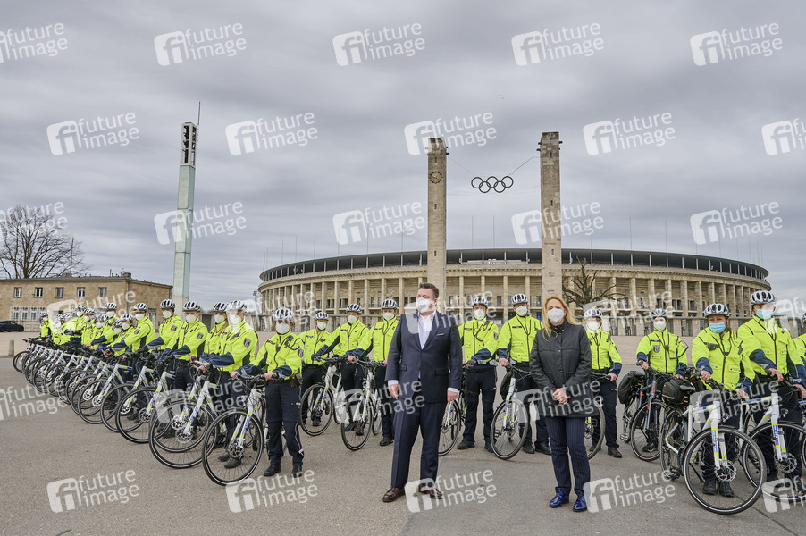 Berlins Innensenator Andreas Geisel und Berlins Polizeipräsidentin Dr. Barbara Slowik bei der Vorstellung der neuen stadtweit tätigen Fahrradstreifen der Berliner Polizei vor dem Berliner Olympiastadion. Berlin, 29.03.2021