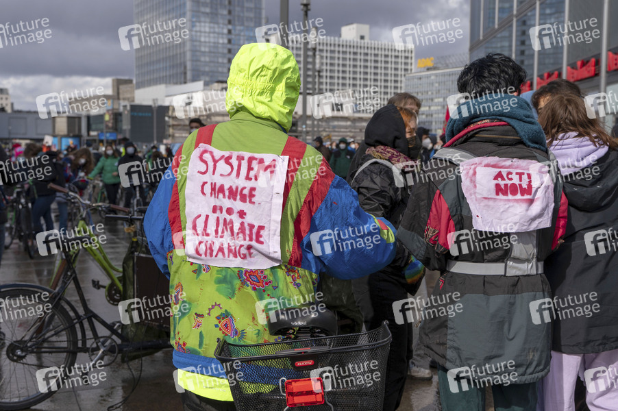 Am Freitag finden mehrere Demonstrationen zum globalen Klimastreik von Fridays for Future in Berlin statt. Auf dem Alexanderplatz startet eine antikapitalistische Fahrraddemo zum Potsdamer Platz. Berlin, 19.03.2021