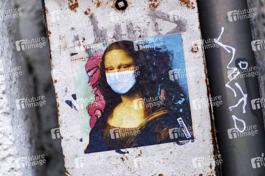Die Kölner Künstlerin Ursula Düster hat einen Sticker mit der Kölschen Mona Lisa mit Mundschutz entworfen, der Aufkleber hängt an 60 Standorten in Köln anlässlich der Coronakrise. Köln, 31.10.2020