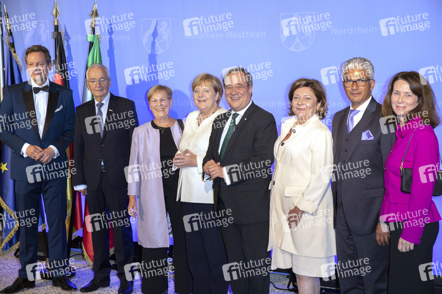 Eckart von Hirschhausen, Klaus Töpfer mit Ehefrau Mechthild, Angela Merkel, Armin Laschet mit Ehefrau Susanne und Ashok Sridharan mit Ehefrau Petra bei der Verleihung des Staatspreises des Landes Nordrhein-Westfalen 2019 an Klaus Töpfer im WCCB. Bonn, 16.09.2019