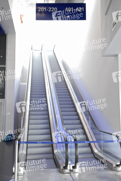 Rolltreppe, multifunktionale Veranstaltungshalle auf dem Gelände des ehemaligen Ostgüterbahnhofs, Halle, Multifunktionshalle, Arena, Grundsteinlegung erfolgte am 13. September 2006, Eröffnung 10. September 2008, Arenafläche 60.000 Quadratmeter, Höhe 35 Meter, 17.000 Sitzplätze