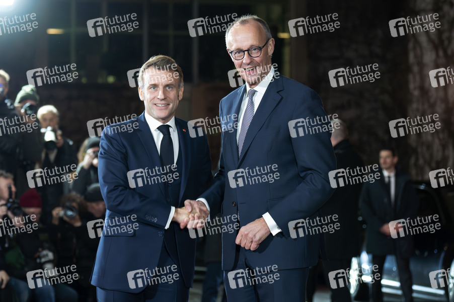 Emmanuel Macron und Friedrich Merz beim Empfang zum Ukraine-Gipfel im Bundeskanzleramt. Berlin, 15.12.2025