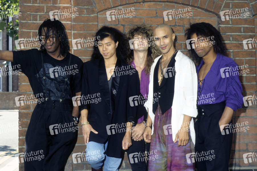 Melvin Brannon II, Blake Sakamoto, Dan Pred, Dan Reed und Brion James von Dan Reed Network bei einem Fotoshooting am Hotel. London, 01.08.1990