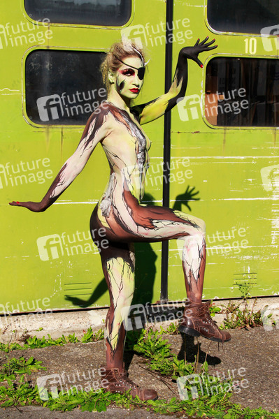 Bodypainting und Photoshooting mit Model Jutta auf einem Industriegelände in Hameln. Bodypaint-Künstler: Jörg Düsterwald, Make-Up und Hairstyling: Nadja Lück