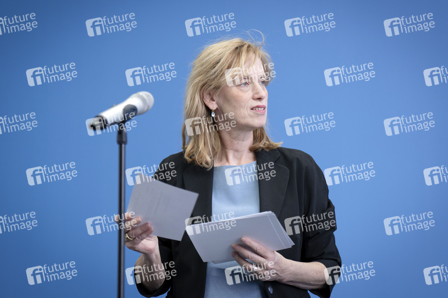 Karin Prien beim Pressestatement zum Gesetz zur Stärkung der Strukturen gegen sexuelle Gewalt an Kindern und Jugendlichen im Bundesfamilienministerium. Berlin, 02.07.2025