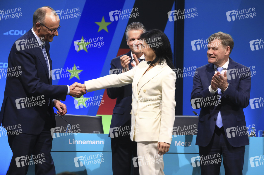 Friedrich Merz, Thorsten Frei, Katherina Reiche und Johann David Wadephul bei der Tagung vom Bundesausschuss der CDU Deutschlands im Estrel Berlin. Berlin, 28.04.2025