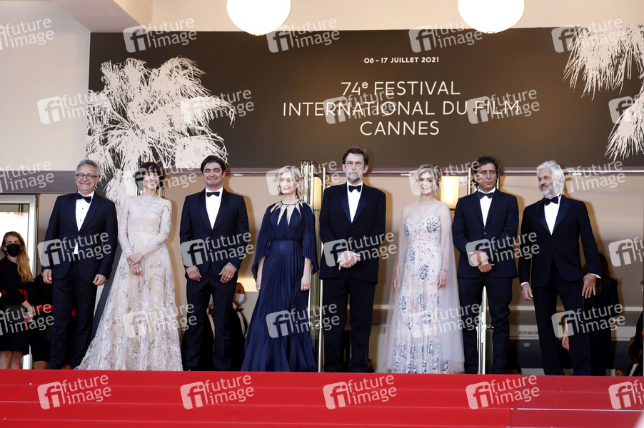 Paolo Del Brocco, Elena Lietti, Riccardo Scamarcio, Alba Rohrwacher, Nanni Moretti, Margherita Buy, Adriano Giannini und Domenico Procacci bei der Premiere des Kinofilms 'Tre piani / Three Floors' auf dem Festival de Cannes 2021 / 74. Internationale Filmfestspiele von Cannes im Palais des Festivals. Cannes, 11.07.2021