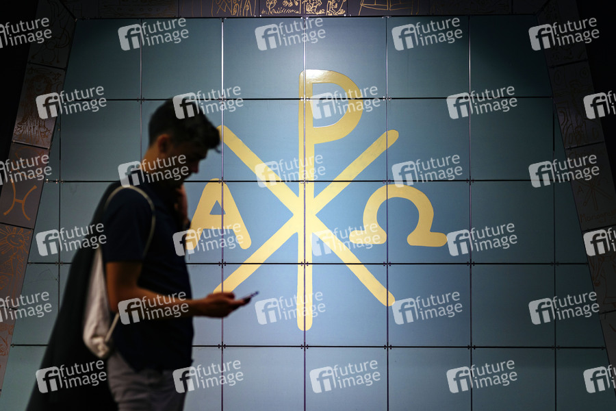 Ein Fahrgast posiert vor den Symbolen des Christentums im Hauptbahnhof. Kirchenaustritte in Deutschland sind auf einem historischen Rekordhoch. Bonn, 23.07.2020