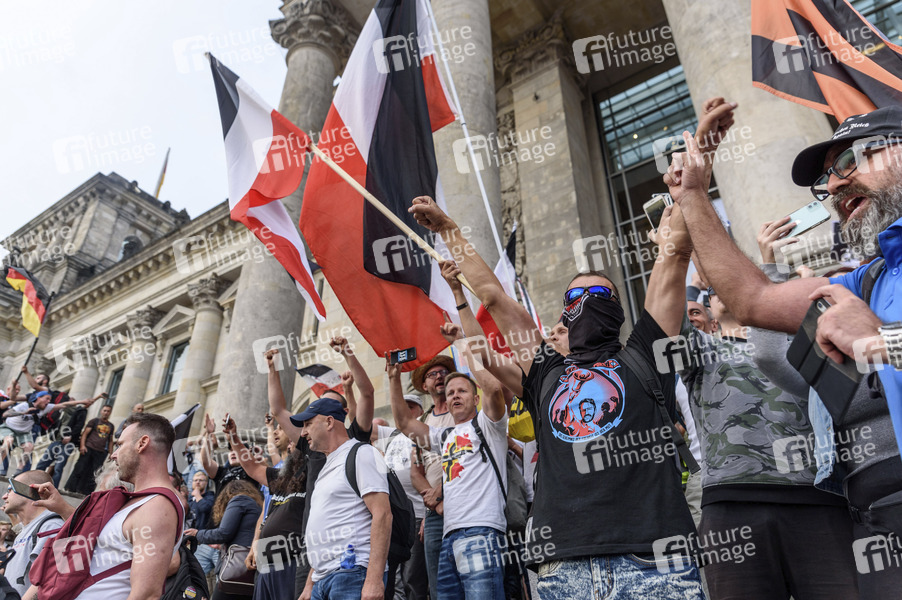 Coronaleugner, Verschwörungstheoretiker und rechte Gruppen der Initiative Querdenken protestieren mit einer Großdemonstration gegen die bestehenden Maßnahmen zur Eindämmung der Corona-Pandemie. Vornehmlich Reichsbürger versuchten im Anschluss an die Abschlusskungebung des Reichstagsgebäude zu stürmen. Es kam zu Auseinandersetzungen mit den eingesetzten Sicherheitskräften. Wegen Nichteinhaltung der polizeilichen Auflagen wurde die Demonstration durch die Polizei beendet. Berlin, 29.08.2020