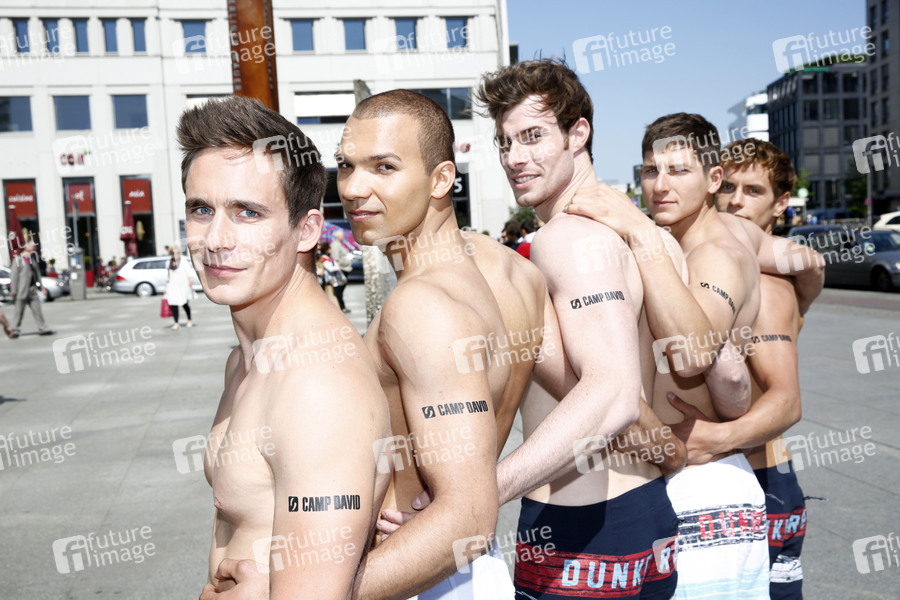 Open Air-Fashionshow des Menswear-Labels Camp David mit Surfern in sexy Beachwear der 'Special Collection Björn Dunkerbeck by Camp David' am Potsdamer Platz. Berlin, 28.04.2014