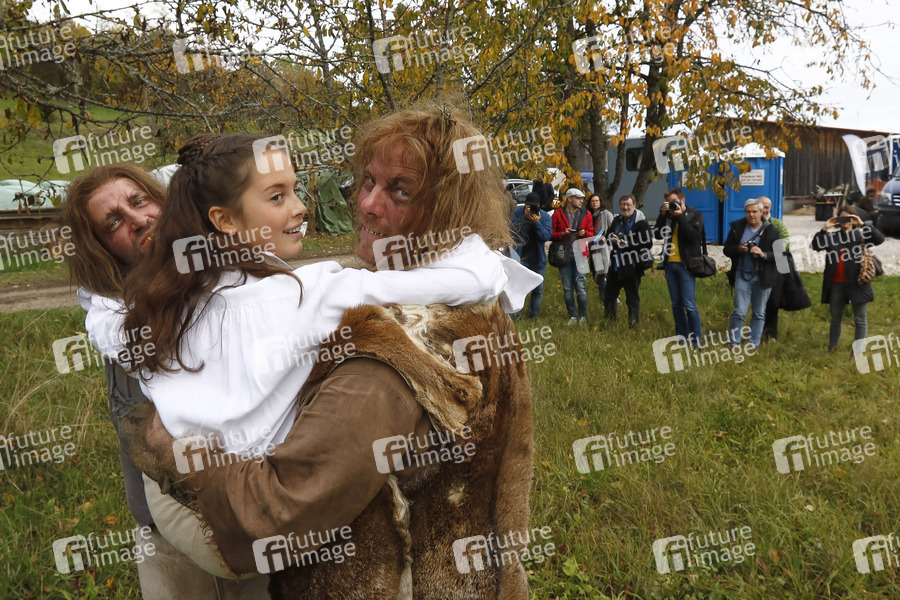 Jonas Minthe, Bianca Nawrath und Stephan A. Tölle beim Fototermin am Set des Märchenfilms 'Der starke Hans' aus der ARD-Reihe 'Sechs auf einen Streich' im Druidenhain. Muggendorf, 17.10.2019