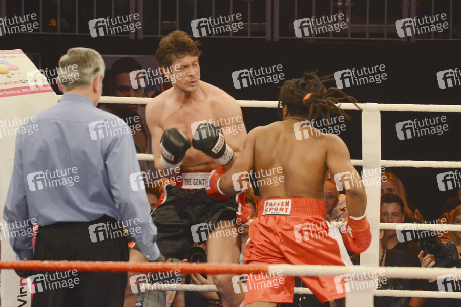Sebastian Deyle vs. Mola Adebisi bei der Fernsehshow 'Das große Sat.1 Promiboxen 2013' im Castello. Düsseldorf, 08.03.2013
