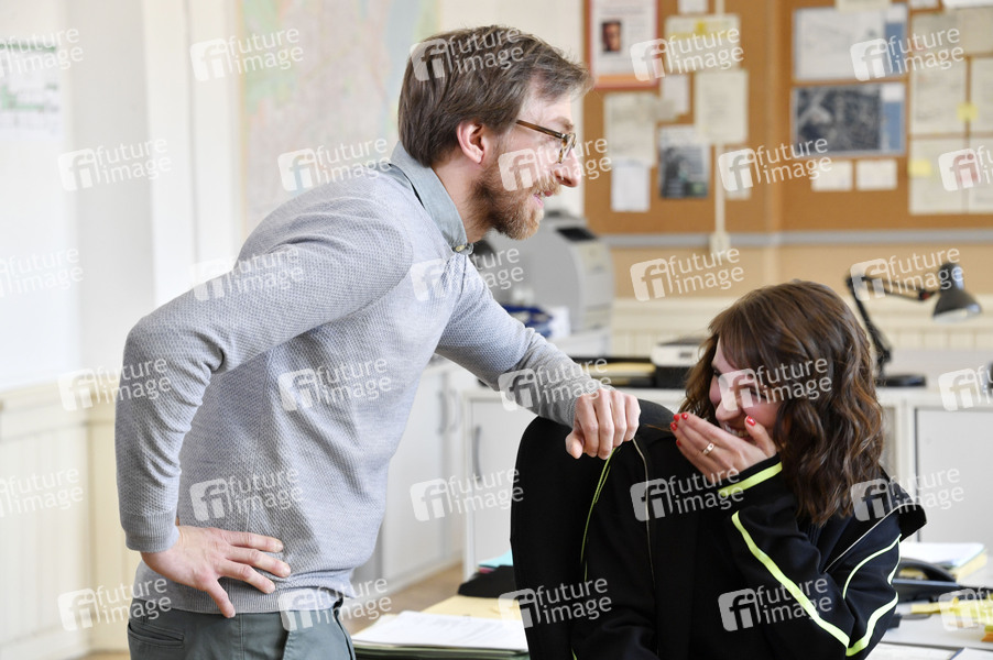 Hendrik von Bültzingslöwen und Caroline Erikson beim Fototermin am Set der 2. Staffel der ZDF Serie 'Soko Potsdam' im Polizeipräsidium. Potsdam, 09.04.2019