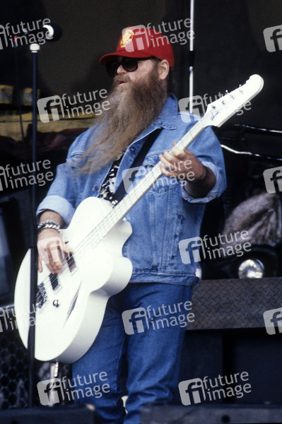 Dusty Hill von ZZ Top beim Soundcheck zum Konzert der 'Recycler World Tour' in der Milton Keynes Bowl. Milton Keynes, 06.07.1991