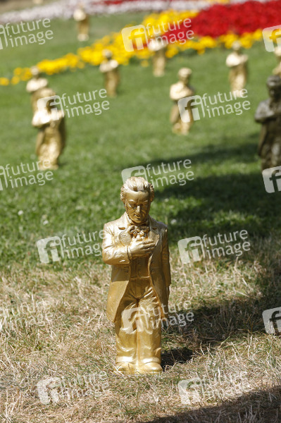 Goldenen Richard Wagner Figuren bei der Eröffnung der 112. Richard-Wagner-Festspiele 2024 mit der Neuinszenierung von 'Tristan und Isolde' im Bayreuther Festspielhaus. Bayreuth, 25.07.2024