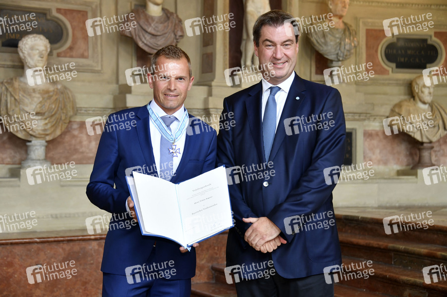 Tobias Angerer und Markus Söder bei der Verleihung des Bayerischen Verdienstordens 2019 im Antiquarium der Münchner Residenz. München, 22.07.2019