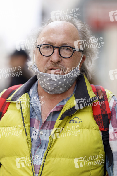 Urban Priol posiert mit Mundschutz im Rahmen eines WDR-Interviews auf der Hohe Straße. Köln, 29.04.2020