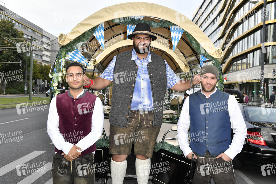 Timur Ülker, Faisal Kawusi und Patrick Heinrich beim Fassanstich bei der 9. Hofbräu Berlin Wiesn im Hofbräu Wirtshaus Berlin. Berlin, 19.09.2020