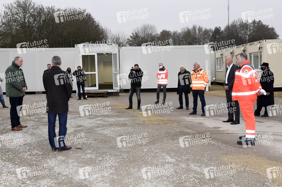 Landrat Christoph Göbel und Bürgermeister Christoph Böck bei der Pressebesichtigung des Impfzentrums Unterschleißheim auf dem Volksfestplatz. Unterschleißheim, 05.12.2020