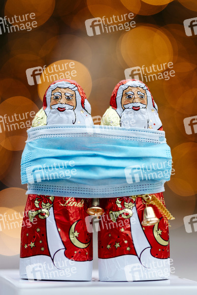 Schoko-Weihnachtsmänner von Lindt halten eine Gesichtsmaske. Im Hintergrund Tannenbäume mit Lichterketten. (Themenbild, Symbolbild) Köln, 27.11.2020