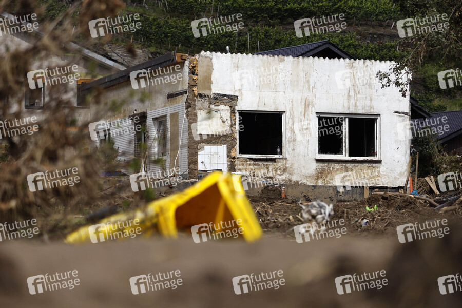 Nach dem Jahrhunderthochwasser in der Eifel durch heftige Regenfälle und Dauerregen mit Überschwemmungen und Überflutungen haben die Aufräumarbeiten im Ahrtal große Fortschritte gemacht. Einheiten von Polizei, THW, Bundeswehr und Feuerwehr mitsamt vielen freiwilligen Helfern haben Straßen geräumt, Schutt und Schlamm entfernt und die Menschen versorgt. Der Wiederaufbau wird trotzdem Jahre dauern. Im Bild Flutschäden in der Ortschaft Mayschoß, in der die Flut viele Häuser zerstörte, 08.08.2021