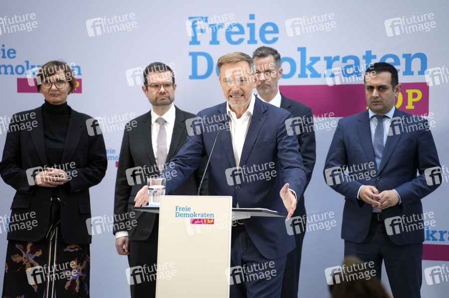 Bettina Stark-Watzinger, Marco Buschmann, Christian Lindner, Christian Dürr und Bijan Djir-Sarai bei einer Pressekonferenz zum Aus der Ampel-Koalition im Hans-Dietrich-Genscher-Haus. Berlin, 07.11.2024
