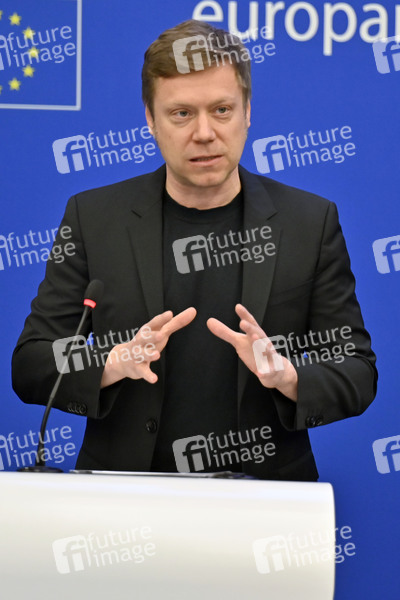 Martin Schirdewan beim Pressebriefing der Fraktion Die Linke im Europäischen Parlament. Straßburg, 05.04.2022