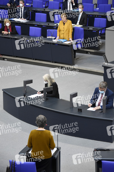Britta Haßelmann und Angela Merkel in der 217. Sitzung des Deutschen Bundestages im Reichstagsgebäude. Berlin, 24.03.2021