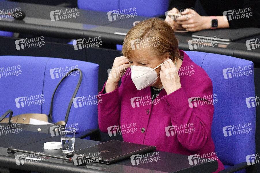 Angela Merkel in der 218. Sitzung des Deutschen Bundestages im Reichstagsgebäude. Berlin, 25.03.2021