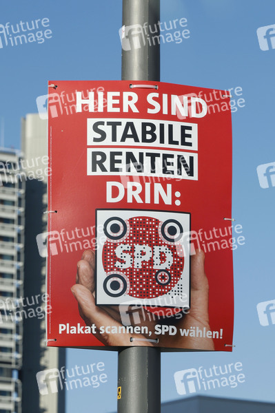 Beeinflussung der Wählerin, Botschaft, Bundestagswahl, Bundestagswahlen, Bundestagswahlkampf, Eigenwerbung, Kleinflächenplakat, Kampagne, Kandidat, Kandidaten, Kandidierende, Logo, Partei, Partei-Symbol, Parteien, Parteienwerbung, Parteilogo, Plakat, Plakatkampagne, Plakatständer, Politik, Politiker, Politikerinnen, Protestwähler, Slogan, Stammwähler, Wahl, Wahlbeeinflussung, Wahlbeteiligung, Wählen, Wählerschicht, Wählerschichten, Wahlkampagne, Wahlkampf, Wahlkampfmodus, Wahlkandidat, Wahlprogramm, Wahltermin, Wahlwerbung, Wirkung, Wirkungsmacht, SPD, Sozialdemokratische Partei Deutschlands, Symbolbild, Symbolfoto, Themenbild