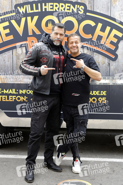Aurelio Savina und Willi Herren bei der Eröffnung von 'Willi Herren's Rievkooche Bud'. Willi Herren stellt seinen Reibekuchen-Truck am Gelände der Selgros vor. Köln, 16.04.2021