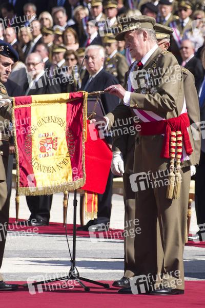 Die Königliche spanische Familie ehrt das Regimiento de Caballeria Acorazado Alcantara Nr.10 am Palacio Real, Madrid