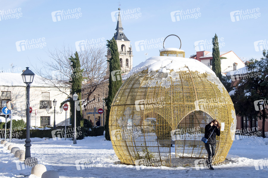 Plaza de Cervantes - Die Region Madrid nach dem Sturmtief Filomena, das in weiten Teilen Spaniens mit starken Schneefällen für Chaos sorgte. Starker Schneefall legte das öffentliche Leben nahezu lahm. Seit 50 Jahren hatte es nicht so geschneit. Alcalá de Henares, 10.01.2021