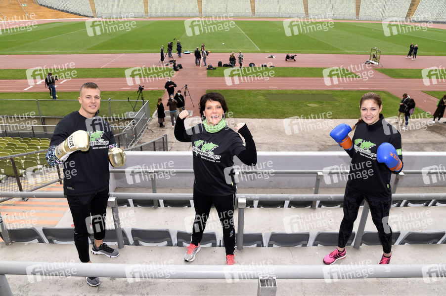 Alem Begic, Janina Hartwig und Marie Lang beim Fototermin zur sportichen '#WocheChallenge' im Olympiastation München. Unter dem Motto 'Wir können was bewegen!' ruft die Welthungerhilfe zu dieser Challenge auf und bittet um Spenden für eine Welt ohne Hunger. München, 13.10.2020