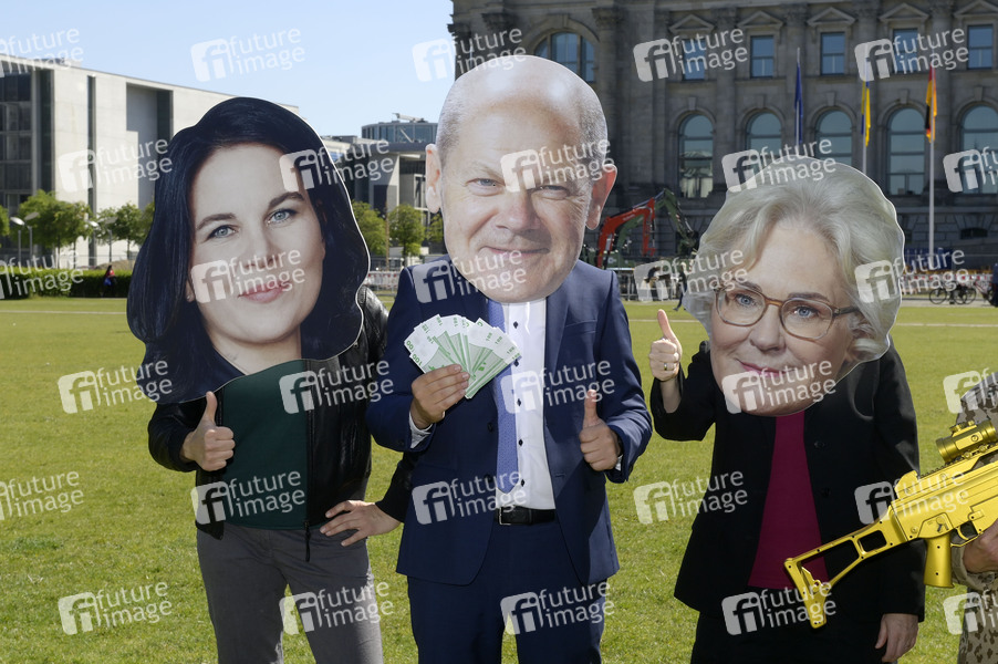 Aktivisten bei einer Protestaktion gegen das sogenannte Sondervermögen von 100 Milliarden für die Bundeswehr vor dem Reichstagsgebäude. Berlin, 03.06.2022