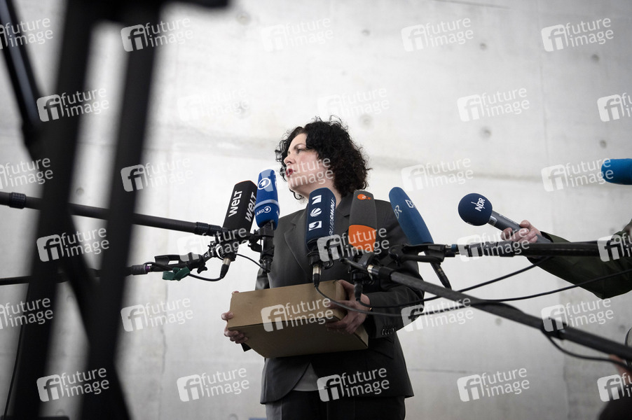 Amira Mohamed Ali übergibt Einspruch vom BSW gegen das amtliche Endergebnis der Bundestagswahl 2025 beim Wahlprüfungsausschuss im Paul-Löbe-Haus. Berlin, 23.04.2025