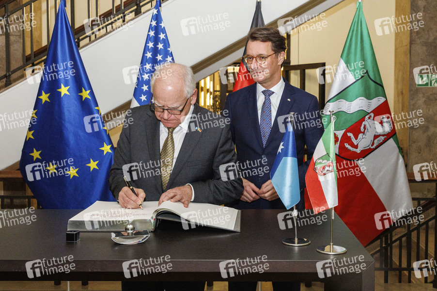 Tim Walz und Hendrik Wüst beim Empfang des Gouverneurs von Minnesota und früheren US-Vizepräsidentschaftskandidaten Tim Walz in der Staatskanzlei. Düsseldorf, 19.11.2025