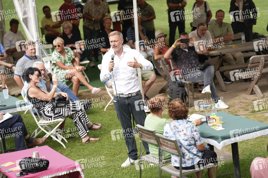 Christian Lindner bei einer Wahlkampfveranstaltung der FDP zur Landtagswahl in Brandenburg im Mahlower Seebad. Blankenfelde-Mahlow, 15.08.2024