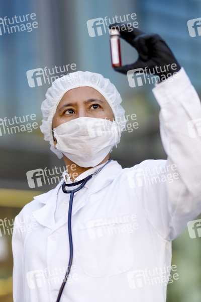 Eine Virologin posiert mit einer Corona-Blutprobe (Symbolfoto mit Model). Nürnberg, 23.04.2020