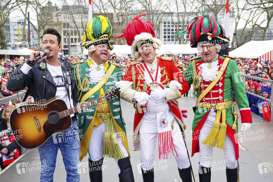 Eldorado Sänger Manuel Sauer mit den Präsidenten der Traditionsgesellschaften im Kölner Karneval beim traditionellen Funkenbiwak auf dem Neumarkt. Köln, 22.02.2020