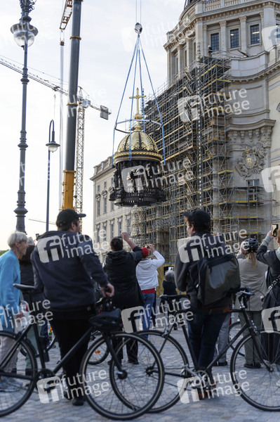 Architektur, Attraktion, Aufsetzung, Baustelle, Bauwerke, Berliner Stadtschloss, Christentum, Fertigstellung, Geschichte, Inschrift, Kolonialismus, Kran, Kreuz, Kultur, Kunst, Kuppel, Kuppelkreuz, Kuppellaterne, Laterne, Monarchie, Montage, Museen, Museum, Rekonstruktion, Religion, Restitution, Schloss, Sehenswürdigkeiten, Sightseeing, Stadtschloss, Wiederaufbau