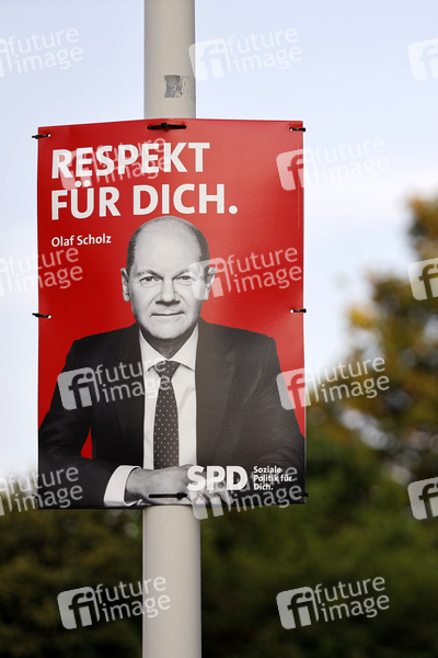 Ein Wahlplakat der SPD zur Bundestagswahl 2021 mit dem Spitzenkandidaten Olaf Scholz und dem Slogan 'Respekt für Dich.' In jüngsten Umfragen zieht der Kanzlerkandidat Olaf Scholz am Kandidaten der Union Armin Laschet vorbei und kann sich beste Chancen auf das Kanzleramt ausrechnen. Frechen, 25.08.2021