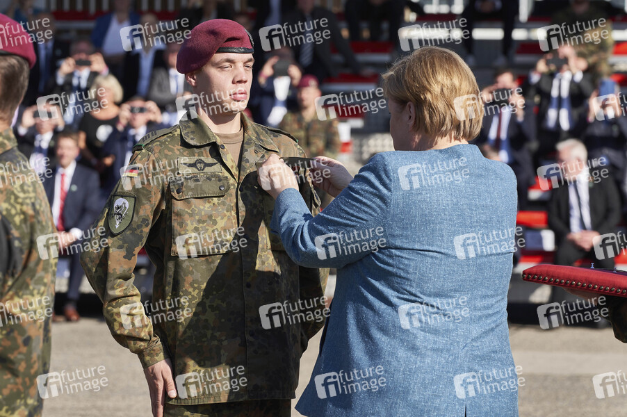 Bundeskanzlerin Angela Merkel bei einem Appell für die Soldatinnen und Soldaten der Evakuierungsmission in Kabul und dem Feierlichen Gelöbnis von Rekruten des Fallschirmjägerregiments 31 in der Fallschirmjägerkaserne Seedorf. Seedorf, 22.09.2021
