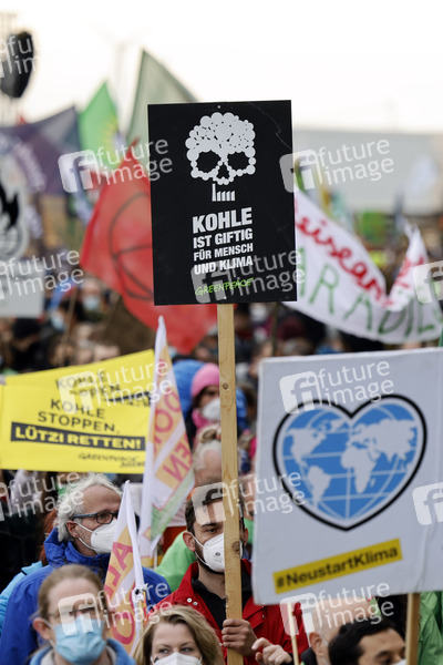 Kohlegegner wie Mitglieder von Greenpeace, Fridays for Future und linksradikalen Gruppen wie der Antifa haben in Lützerath gegen den Tagebau protestiert. Das kleine Dorf an der Kante von Garzweiler soll dem Braunkohleabbau weichen. Allerdings will der Energiekonzern RWE vorerst auf den Abriss verzichten. Im Bild Teilnehmer der Demo gegen den Abriss. Lützerath, 31.10.2021